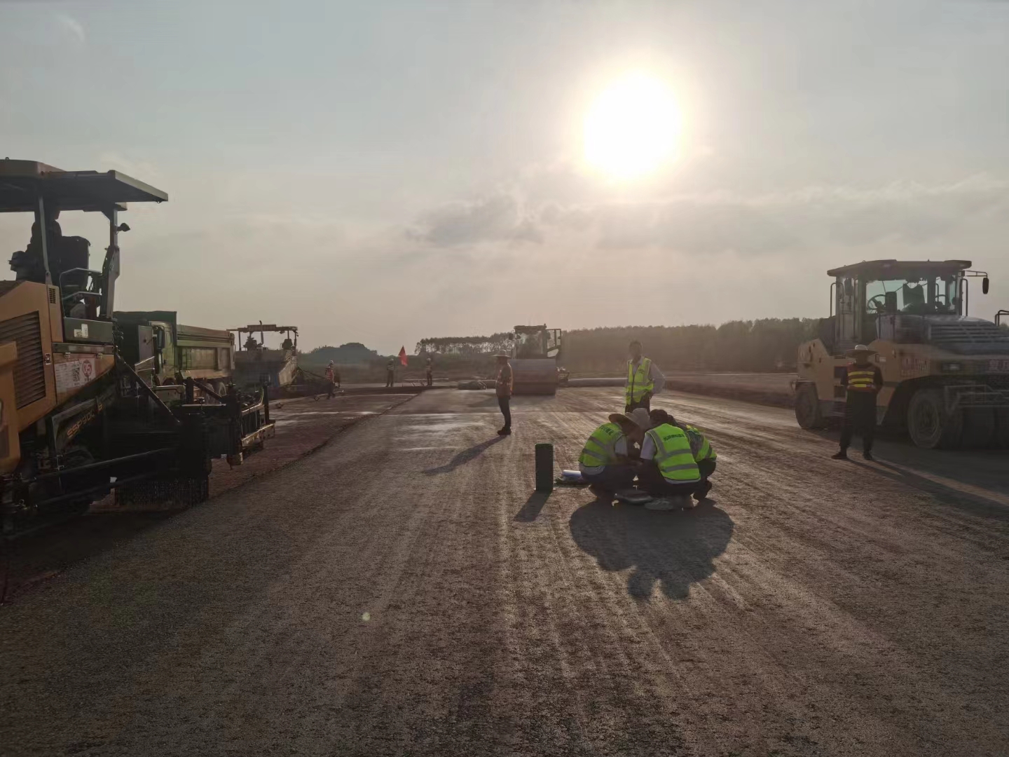 為確保試驗(yàn)段攤鋪設(shè)備工作高質(zhì)、高效進(jìn)行,項(xiàng)目部統(tǒng)一部署,各部門相互配合,認(rèn)真進(jìn)行施工前各項(xiàng)準(zhǔn)備工作,提前對(duì)有關(guān)人員進(jìn)行安全培訓(xùn)和技術(shù)交底。施工現(xiàn)場(chǎng)井然有序,項(xiàng)目負(fù)責(zé)人嚴(yán)格把控運(yùn)輸、攤鋪、碾壓、檢測(cè)等各施工環(huán)節(jié),保證施工質(zhì)量與安全,同時(shí)對(duì)試驗(yàn)段標(biāo)高、壓實(shí)度、平整度和厚度等各項(xiàng)指標(biāo)進(jìn)行實(shí)時(shí)檢測(cè)并記錄,確保各項(xiàng)指標(biāo)符合技術(shù)規(guī)范要求,并確定水穩(wěn)層松鋪系數(shù)、壓路機(jī)最佳碾壓遍數(shù)及速率,最終達(dá)到預(yù)期試驗(yàn)效果。