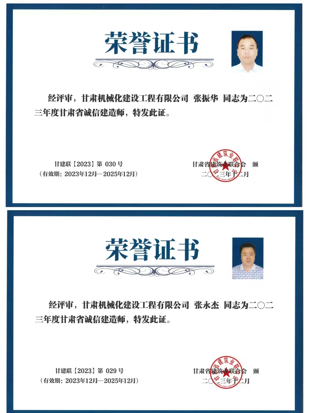 張永杰與張振華兩位同志獲得2023年度甘肅省誠信建造師榮譽稱號。